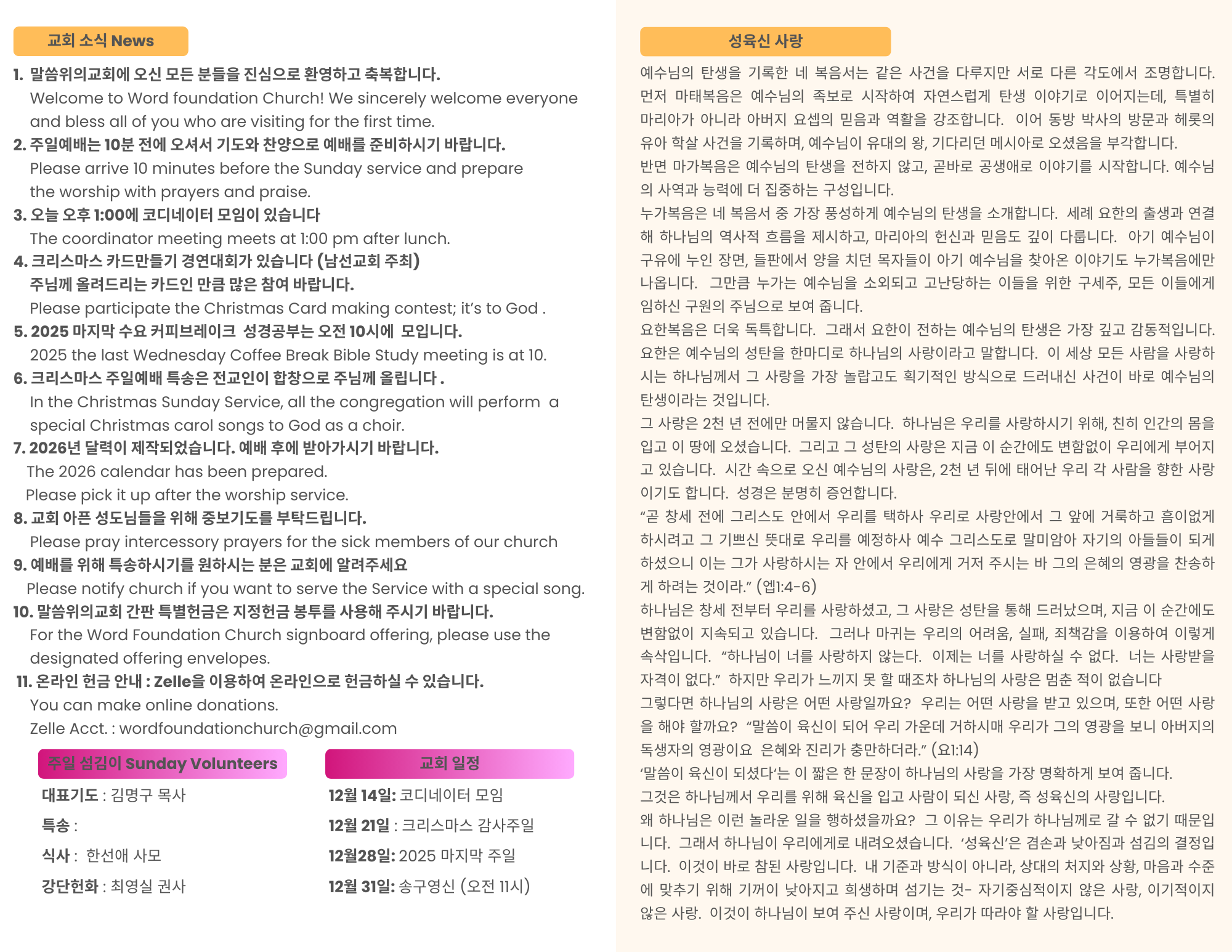 Full 1교 회 주 보 2025년 12월 14일 주보 Author Admin Date 2025-12-14 10:54 Views 15 Like 0 Unlike 0 Print « 2025년 12월 7일 주보 2025년 12월 21일 주보 » List Reply Powered by KBoard